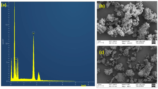 Image of α-Si3N4 particle: (a) EDS, (b) FESEM analysis at higher magnification, (c) FESEM at lower magnification.