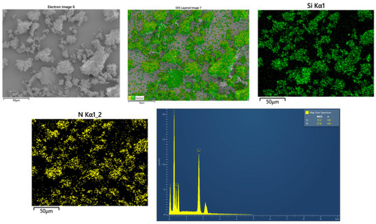 Figure 1 shows the apparatus used to fabricate the baseline copper alloy with 10 wt% Sn and Cu-10Sn/Si3N4 MMCs with varying wt% of Si3N4 (5, 10, and 15 wt%). The stir-casting technique was explicitly used here to enhance the bonding between the base alloy and the added silicon nitrate. This process was initiated by feeding pure Cu into a clay–graphite crucible, which was then melted in a furnace with a stirrer. As the temperature inside the furnace reached copper’s melting point of 1085 °C, Sn with 10 wt% was introduced into the crucible. The mechanical stirrer attached to the furnace was gently lowered into the molten mixture. Then, the stirring process was initiated at 200 rpm for about 10 min to ensure the homogeneous spreading of ceramic particles inside the matrix. In this stirred mixture, the α-Si3N4 reinforcement preheated at 300 °C was gradually added with the help of a hopper. The fed-in reinforcement had an overall particle size of 25 µm (analyzed by ImageJ software, Software Version: 1.53t), as shown in Figure 2. Figure 3 depicts the elemental map spectrum of the reinforced particle used in the current study. Moreover, Figure 2 and Figure 3 confirm the purity of the Si3N4 particle employed in the present study. The composite melting was followed by adding 1 wt% Mg to increase the wettability of reinforcement with the matrix [31]. Liquifying the solid metal to a molten state was completed in an inert Argon gas atmosphere to restrict oxidation.