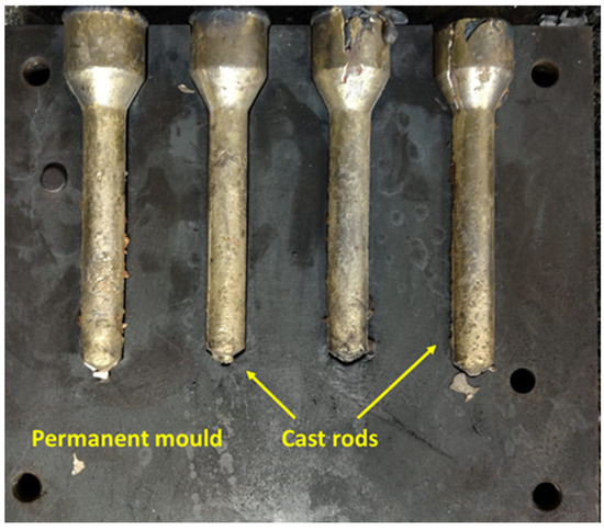 A carbon tetrachloride (CCl4) tablet was employed to flush out unnecessary gases from the molten mixture. The final melt obtained was fed into a permanent diecast mould coated with LUBRIKOTE die coat material at a temperature of 1150 °C to produce rods with a radius of 16 mm and a length of 140 mm, as shown in Figure 4. Advanced characterization techniques (FESEM, TEM, and XRD) were used to characterize the fabricated baseline alloy and MMCs, which have already been reported in our previous publication [30]. Table 1 depicts the wt% of Si3N4 samples used in the current investigation.
