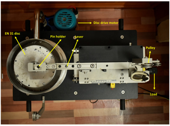 The sliding wear test was performed according to the ASTM G 99-04 standard, with no lubrication and at room temperature (30 °C). As shown in Figure 5, the pin-on-disc wear testing apparatus was used to conduct the wear test. The cast samples were machined and polished into specimens measuring Φ12 mm × 35 mm in length. The specimens were then cleaned with acetone before being weighed on an electronic scale with 0.001 g least count. The cylindrical specimen’s flat end was in contact with the tribometer disk manufactured of EN 31 hardened steel with a hardness value of 62 HRC. The disc and pin materials’ roughness (Ra) was 0.1 and 0.8 m [32]. The wear testing parameters for the test are depicted in Table 2. The parameters for the wear test were obtained from Akshay et al. [33]