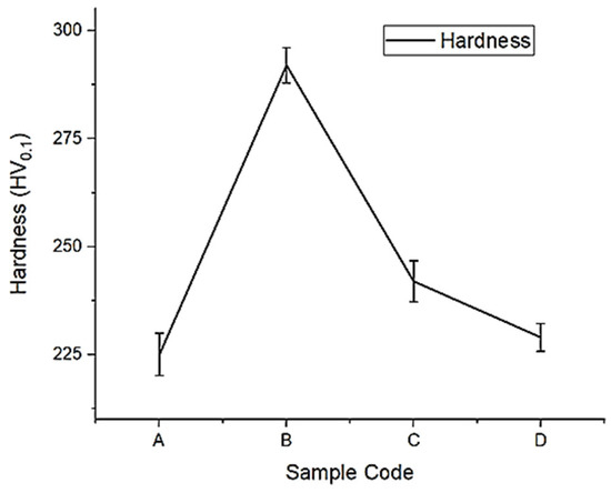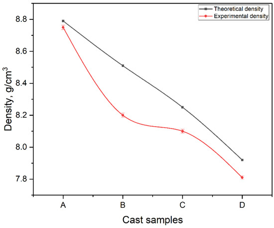 Table 3 and Figure 6 depict the theoretical and experimental densities of regular bronze Cu-10Sn alloy and stir-cast MMC; the sample designated as D possesses the lowest density value. A quick look at Table 3 reveals that the empirical values of the density of the specimens were lower than those obtained theoretically. This trend can be cited as the variations in the matrix and the reinforcement densities; hence, the observation that Sample D has minimum density indicates the addition of Si3N4, with a minimum density value. Therefore, the one with the lowest density value is prophesied to be the lightest.