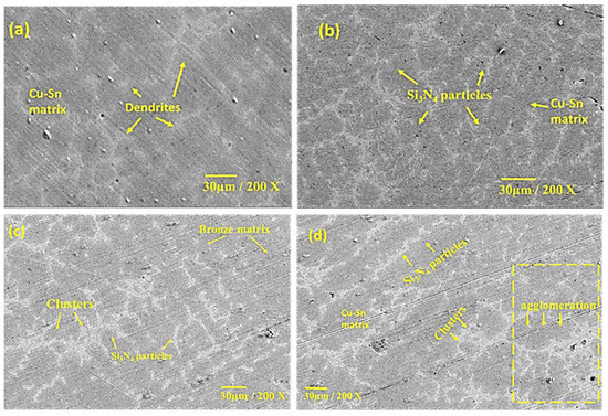Figure 7b–d shows the microstructure of stir-cast MMCs having different weight percentages of Si3N4 (5, 10, and 15). A near look at Figure 7b indicates that the base alloy with 5 weight percentage of Si3N4 possesses homogeneous distribution of reinforcement amidst the matrix, showing no traces of clustering. The reason for this is the continual stirring of the molten metal before being fed into the mould. Moreover, this sample with 5 wt% Si3N4 has shown excellent adhesion with the base alloy against other fabricated MMCs. Figure 7c depicts the regular bronze alloy incorporated with 10 wt% of Si3N4. Here, the non-uniformity of ceramic particles within the bronze matrix exists, and clustering is visible at random locations. Thus, this leads to the perception that, with increasing Si3N4 ratio, distribution also tends to become more non-uniform. Figure 7d shows the inadequate distribution of reinforcement in the matrix with particles agglomerated at specific locations. Agglomeration means the cohesion of particles towards each other by weak forces of attraction. The cause for this phenomenon in this investigation is the large surface-to-volume ratio possessed by these Si3N4 ceramic particles. Thus, the surface energy of these particles would be very high due to the presence of unoccupied atoms. Hence, they always strive to bond with neighbouring ones using weak attractive forces such as van der Waals forces, forming a micron-sized agglomerate. This uneven distribution of Si3N4 here and there in the bronze matrix disrupts and limits the mechanical properties of the composite, as reported in our previous study.