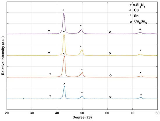 The as-cast base alloy and the stir-cast composite manufactured from it were subjected to X-ray diffraction to analyze the various phases involved. The XRD results of the as-cast alloy and its composite are depicted in Figure 8. On further analysis, sample A produced copper and tin phases, while specimens B, C, and D produced copper, tin, and α-Si3N4 phases. Moreover, all the developed samples possessed Cu6Sn5 as an intermediate phase. The existence of Si3N4 within the bronze matrix indicates that the development of the MMC is successful. The lattice structure of Si3N4 reinforcement, gained from the current research, agrees with the investigation by Hardie and Jack (1957) [25].