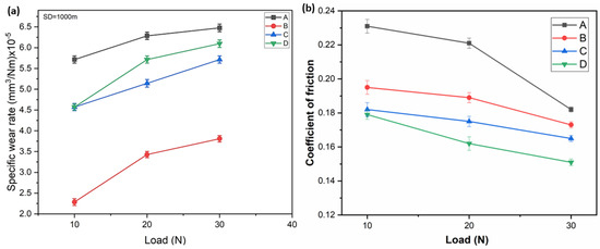 (a) Variation of specific wear rate; (b) variation of coefficient of friction with load variation.
