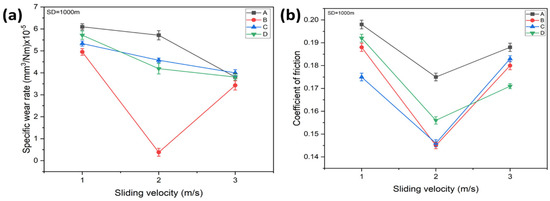 The variation of sliding velocity with (a) specific wear rate and (b) coefficient of friction (COF).
