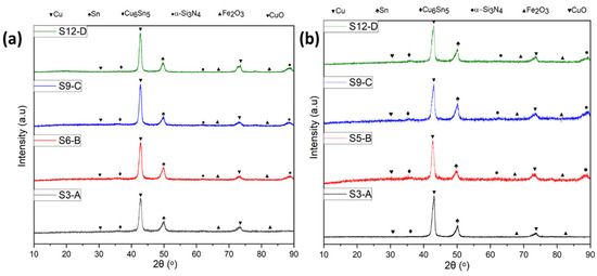 The XRD analysis of the MML or tribolayer of the developed alloy and composite is depicted in Figure 12a,b. Figure 12a shows the XRD analysis of the MML/tribolayer for high wear rate (refer to Table 6) on varying loads, and Figure 12b depicts the XRD analysis of the tribolayer for lower wear rate (refer to Table 7) on varying sliding velocities. However, the specific wear rate for Sample B was enhanced from 2 to 3 m/s rather than decreased from 1 to 3 m/s. This might be caused by breaking the MML/tribolayer at 3 m/s that formed on the rupture of the friction surface. The removal of MML must be accompanied by replenishing fresh material from the pin, thus enhancing the material’s specific wear rate. Specimen B has shown a minor wear rate among the rest of the composites and the unreinforced alloy. On the contrary, the highest wear rate in the pure unreinforced alloy can be regarded as the absence of hard Si3N4 particles.