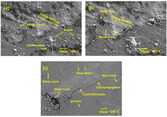 When the load was subsequently increased to 30 N, the image depicted in Figure 14c gives evidence of crack formation. Furthermore, this detailed image at 600× shows a clear picture of the propagation of the developed crack. Further increases in the load will cause catastrophic alloy failure. As mentioned earlier, since friction might have increased the surface temperature, the ensuing heat prompted a reduction in the strength of the material. Thus, the sliding movement between the specimen and its counterpart created small cracks on the softer material’s surface. These cracks then propagated by deflecting and bifurcating through the specimen surface upon repeated sliding, eventually forming delamination. Figure 14c depicts the crack tip and propagation path, thereby providing a ground for precise interpretation of the phenomenon.