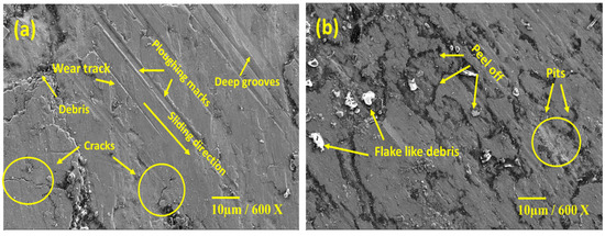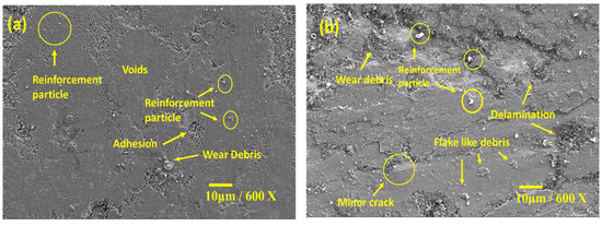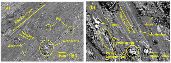Figure 17 represents the FESEM images of Sample D with 15 wt% Si3N4 reinforcement under a constant sliding distance of 1000 m and sliding velocity of 3 m/s. A close analysis of Figure 17a gives substantial evidence of pits and shallow grooves. The hard particles of Si3N4 that were peeled off while repeatedly sliding at the load of 10 N might have become trapped in between the specimen surface and its sliding counterpart. This caused the surface particles to plough off when rubbed against each other, leaving traces as grooves. From Figure 17b, the wear loss increased further when the load was increased to 30 N. At the 15 wt% reinforcement condition, particles started agglomerating, reducing the hardness, and increasing the specific wear rate per Archard’s wear adhesion theory. The concentration of such particles at random points made it easy for them to be ploughed off by the sliding action of the specimen with a harder counterpart. The presence of delamination along with grooves is evident from the image. As mentioned in Figure 17b, the picture shows that flakes and particle agglomeration can be observed.