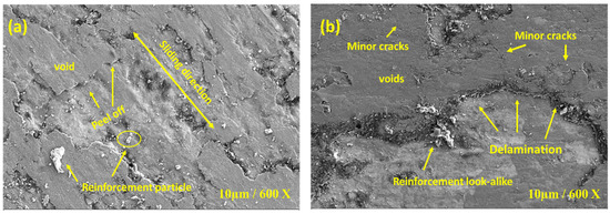 Figure 16 depicts the FESEM images of Sample C with 10 wt% Si3N4 reinforcement under a constant sliding velocity of 3 m/s and sliding distance of 1000 m. From Figure 16a, it can be noted that there are several patches with particle peel-off along the sliding direction of the specimen. This can be attributed to the decreased strength of the base alloy with 10 wt% reinforcement. However, even then, the non-uniform bonding of the increased silicon nitrate particles created protrusions, which might have resulted in a cut-off. On close analysis, faint grooves can also be found, which altogether accounts for the existence of the abrasive wear mechanism. Upon increasing the load to 30 N, lengthy irregular patches with particle dissemination can be observed in Figure 16b. This points out delamination. The unevenly spread reinforcement particles failed to hold up the increased load of 30 N, which resulted in this kind of wear behaviour.