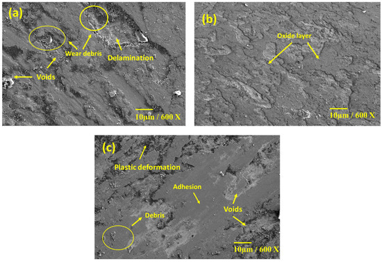 Figure 19a–c represents the FESEM images of Sample B under a constant sliding distance of 1000 m and a load of 30 N. The analysis of Figure 19a draws on the exact inference of delamination and the creation of a series of voids and wear particles. However, other than that, the presence of a void also indicates an effect of the adhesion wear mechanism. Adhesion wear could have happened due to particle transfer from the matrix surface to its sliding counterpart. Meanwhile, Figure 19b depicts the oxide layer formed when the sample is under constant sliding distance and load for a sliding velocity of 2 m/s. The formation of a tribolayer/MML reduces the specific wear rate at this velocity. Any further increase in the velocity causes the breakage of this mechanically mixed layer. Figure 19c shows the worn-out surface of Sample B at 3 m/s and shows instances of plastic deformation rather than crack-propagated delamination. This might have occurred due to the rubbing of hard particles against a soft metal matrix that prompted the particles to peel off the surface, thereby breaking the tribolayer formed at 2 m/s. Adhesion-induced voids can also be found in Figure 19c.