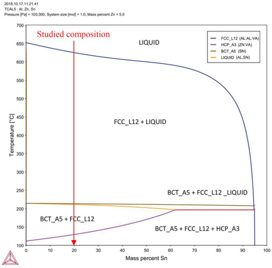 Pseudo-binary phase diagram generated by the Thermo-Calc software version 2019b (TCAL5 database) for the Al-5Zn-Sn [wt.%] alloys. Red arrow indicates the studied alloy. On the left lower corner, it is shown the Thermo-Calc software symbol.
