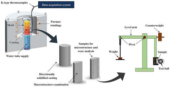 To achieve the goal of this work, samples with different thermal histories during solidification will be produced using a directional solidification technique. Then, samples with quite distinct parametric microstructural features will be subjected to ball-cratering tests. Hardness tests will be conducted as well. Such a methodology is planned to allow for the analysis of processing–microstructure–wear relationships. In summary, the main contributions of the present work are as follows: