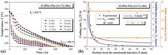 (a) Cooling curves collected at different heights of the DS Al-20Sn-5Zn [wt.%] alloy casting; (b) Sn and Zn concentrations, VL, and TR profiles.