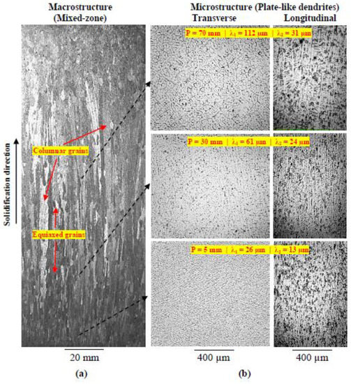 3.2. Microstructure Features and Their Relationship with Solidification Thermal Parameters
