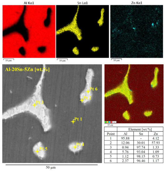 SEM images with EDS analysis, shown in Figure 5, demonstrate that the Al-rich matrix is surrounded by Sn-rich particles and that Zn can be found in both the Al-rich matrix (in solid solution) and in the Sn-rich phase (as Zn particles). A possible reason for the peak of the Zn-rich phase to be less intense could be associated with the doubt whether Zn particles effectively occur in such a small fraction. It must be stressed that Zn is also contained in the Al-rich solid solution. In fact, it is likely that non-equilibrium conditions promoted the suppression of Zn diffusion in solid state, leading to a supersaturated α-Al matrix. At room temperature, the solubility of Zn in Al is below 0.1 wt.%, which is substantially lower than the verified values (~4 wt.%). It is not surprising that Sn-rich particles are all found in interdendritic areas, given that the solubility of Sn in Al is approximately 0.01 wt.% at room temperature, which is extremely low. This agrees with the XRD patterns given in Figure 6, where reflections of α-Al, Sn and β-Zn phases can be clearly identified.