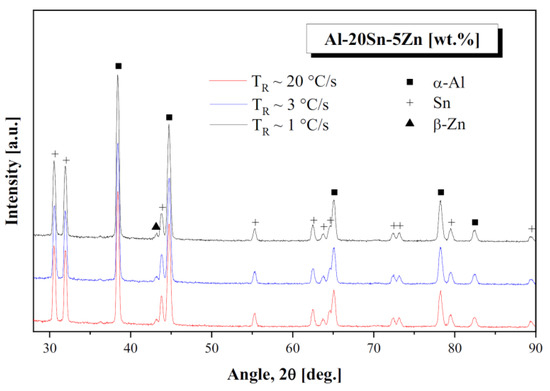 X-ray diffraction patterns obtained for Al-20Sn-5Zn [wt.%] alloy samples solidified at three different TR values.