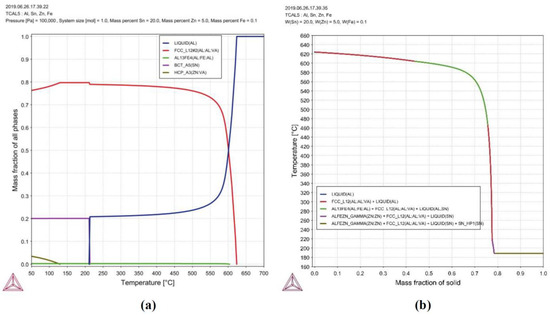 (a) Property diagram and (b) Scheil–Gulliver solidification path of the Al-20Sn-5Zn [wt.%] alloy. On the left lower corner, it is shown the Thermo-Calc software symbol.