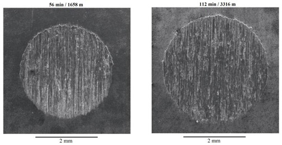 Typical worn craters for the two longer sliding distances (1658 and 3316 m) considered for the wear analysis of the directionally solidified Al-20Sn-5Zn [wt.%] alloy.