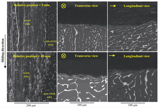 SEM images of the above view as well as transverse and longitudinal sections of worn craters. Samples corresponded to the relative positions 5 and 40 mm in the casting (test time = 112 min). The transverse and longitudinal craters consider the central area of the craters.