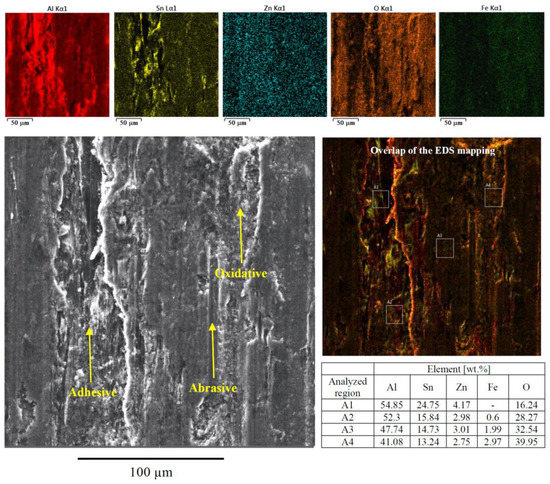 The above explanations allow for a better interpretation of the effects of the microstructural phases on the wear behavior. Overall, the tough Al-rich dendrites are responsible for most of the resistance to mechanical loading. It is also the main phase to be detached and to compose the wear debris along with other oxides. Zn is almost entirely present in the Al-rich matrix. Due to its higher mechanical strength, Zn reinforces the Al-rich matrix. The main role of Sn is to act as solid lubricant. During friction, the Sn particles are detached from the alloy and spread over a continuous Al-rich matrix, forming a lubricant film. It is important to recall that Sn particles are located at the interdendritic areas.