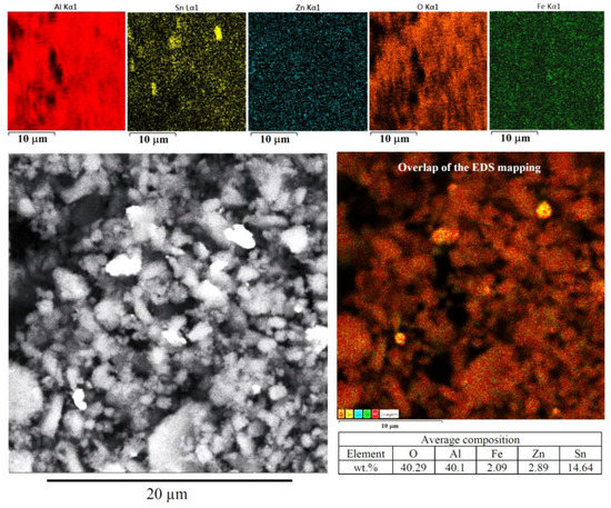 Figure 12 reveals the typical appearance of wear debris, which were composed mainly of oxides. It is worth noting that the occurrence of debris may undergo continued breakdown during the formation of transient oxides. In addition, there was a competition between the formed debris and the solid lubricant layers on the sliding metal contact of the Al-Sn-Zn alloy samples, with the formed debris acting as a third-body abrasive that magnify the wear process. Significant amounts of Al and Sn were detected, which was to be expected since both are the main elements in the alloy and in the removed material.