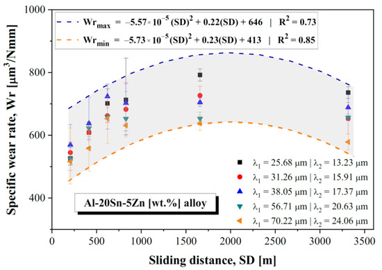 Figure 13 associates the specific wear rate (Wr) to the sliding distance (SD). Until SD = 1658 m, Wr increased progressively. After that, Wr had a slight decrease. Two parabolic equations are proposed to represent the possible range for Wr. Although the experimental points are relatively close to each other, those that correspond to finer microstructures tend to have higher Wr values. Just as this study, other works have focused on a better understanding of the relationships between microstructure and wear features of directionally solidified Al-based alloys using ball-cratering tests. This is the case of the study conducted by Cruz et al. [5], where an Al-20Sn alloy was demonstrated to have its wear resistance reduced with the microstructure refinement. It is worth mentioning that such a study was taken herein as reference to verify if the addition of 5 wt.% Zn would be able to improve the wear resistance of the Al-20Sn alloy. Recently, Botelho et al. [19] and Azevedo et al. [20] have used ball-cratering tests to investigate the dry sliding wear behavior of the Al-7Si-0.3Mg and Al-3Ni-1Bi alloys. They observed that the dry sliding wear resistance tended to improve with microstructure refinement, which is the opposite to that found by Cruz et al. [5]. A common aspect between the present study and all of these three works is the variation in the SD. More specifically, the SD of 415 and 829 m were adopted in all of them. Although each work adopted a different normal load (Cruz et al. [5] = 0.6 N; Botelho et al. [19] = 0.2 N; Azevedo et al. [20] = 0.2 N), the specific wear rate can be used as a comparison factor.