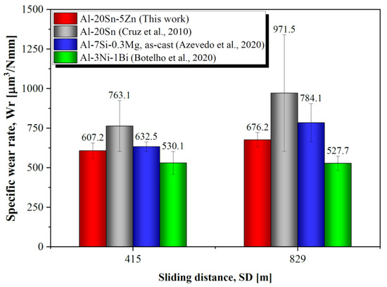 Figure 14 compares the Wr of the studied alloy to the above-mentioned studies. Only two SD values are considered because they are the only ones in common for all studies. For each SD, the respective Wr value represents the average of all points obtained, i.e., that a Wv likely to be true or likely to happen. Although the Wv values seem to be closer to each other, they allow for some interpretations. For SD = 415 m, the Al-20Sn-5Zn alloy has a lower Wv compared to the Al-20Sn alloy. When SD increases to 829 m, both alloys are characterized by an increase in Wv. However, the binary alloy achieves an Wv value even higher. That means the 5 wt.% Zn addition induced an improvement in the wear resistance. In fact, the Al-20Sn-5Zn alloy has Wv values lower than that of the Al-7Si-0.3Mg alloy. The increase in Wv is also noticed for the Al-7Si-0.3Mg alloy. The only exception is the Al-3Ni-1Bi alloy. It is worth noting that these two alloys contain harder phases in their compositions, which may strengthen the alloy, thus favoring a lower Wv.
