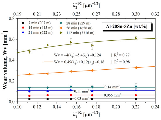 Wr values were calculated using Equation (2), which depends on the wear volume (Wv) determined from Equation (1). That means, Wv is determinant in their calculation. Wv values are plotted against the primary and secondary dendritic arm spacings (in Hall-Petch format) in Figure 15. For the first four times (7–28 min), the wear volume presented a constant profile, with no changes in Wv being induced by the microstructure length scale. For 56 and 112 min, however, finer microstructures favored higher Wv values. For both times, the microstructure refinement had a negative impact on wear resistance. The detrimental effects are noted to increase with increasing test time. Cruz et al. [5] pointed out that larger Sn-particles seem to promote more adequate self-lubricating features. Apparently, such effect is also typical of the Al-20Sn-5Zn [wt.%] alloy but becomes observable and more pronounced for longer sliding distances. Therefore, a possible explanation for this is the interference of the oxidation process on the lubricating effect of Sn-particles. For longer test times, smaller Sn-particles are not strong enough to support such competition with the oxide layer. Two multiple linear regression (MLR) equations are proposed to represent variation of Wv with the primary (λ1) and secondary (λ2) dendritic arm spacings, one for each condition (test times of 56 and 112 min). Table 2 contains the results of all MLR analyses conducted in this work.