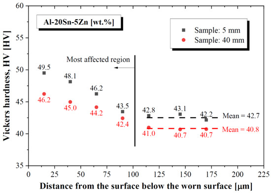 Figure 17 shows the hardness values for different distances below the worn surfaces of the samples p = 5 and 40 mm. Such samples represent the two extremes achieved herein for the microstructure length scale. Each point in the graph represents the mean value of 4 measurements of hardness. For both samples, the region most affected by plastic deformation is approximately 100 μm below the worn surface. After such a location, the hardness remains constant. It is interesting to note the sample p = 5 mm reveals a more expressive variation in hardness. Considering their respective first points below the worn surface, the sample p = 5 mm has an increase in hardness of ~13.7%, while the sample p = 40 mm increases ~11.7% with respect to the hardness of their respective unaffected region. That means finer microstructures are more likely to undergo plastic deformation (there is more propensity) during the wear tests, which confirms the analysis of Figure 10.
