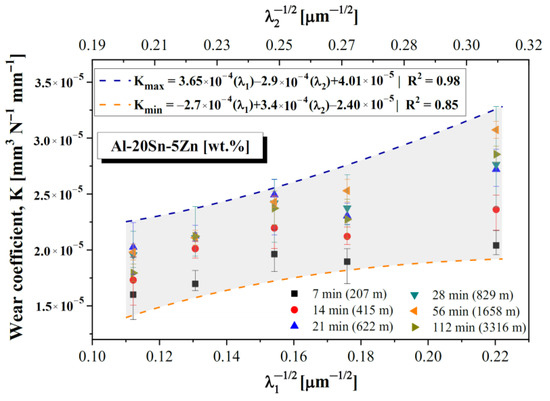 It is important to point out that, unlike the Archard’s equation, this work reveals an inverse dependence of wear resistance on hardness, which naturally affects the K values. Thus, Figure 18 simultaneously relates the K values to the primary (λ1) and secondary (λ2) dendritic arm spacings. Two equations determined from multiple linear regression (MLR) are proposed to represent the possible range for K under the adopted conditions. One equation describes the behavior of maximum K values, while the other characterizes the minimum K values. Overall, K is lower during the initial test times (7 and 14 min). It only achieves relatively higher values for longer tests (higher sliding distances). It is worth noting that K tends to increase with microstructure refinement.