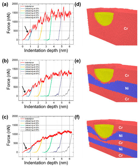 - Based on the F–D curves obtained in the indentation process, the five-layer model showed ~39% and ~12% smaller repulsion force than those of the one-layer and three-layer models, respectively. Unloading stiffnesses were calculated to be 5436, 3078, and 2342 nN/nm for one-, three-, and five-layer models, respectively. The results are attributed to the fact that Cr has been reported to have higher mechanical properties than Ni and that the one-layer model consisted of Cr atoms only.