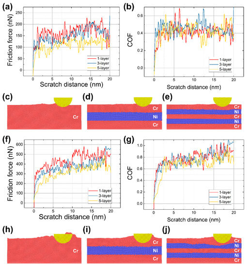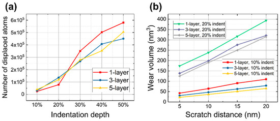 - At the indentation depth of 50% of the total thickness, the amount of plastic deformation of the one-layer model was 28.8% and 15.0% higher than those of the three-layer and five-layer models, respectively. The wear volume of the five-layer model when scratched was at most 68.4% lower than that of the one-layer model at the indentation depth of 10%.