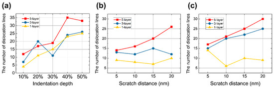 - The number of dislocation lines in the five-layer model showed a consistently increasing trend when indented and scratched. The five-layer model showed 1.20~3.33-fold higher numbers of dislocation lines than those of the other models when scratched. Based on the increase in dislocation density, the mobility of dislocation lines was decreased, resulting in higher resistance to plastic deformation.