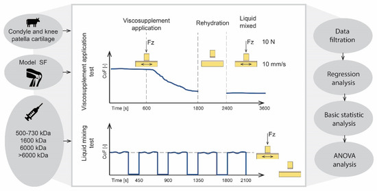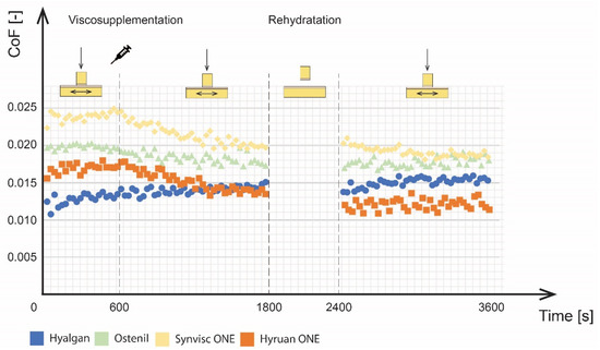 Viscosupplementation effects were observed using two types of experiments. The first experiment simulated the state where a viscosupplementation agent was applied to the patient. The friction pair was lubricated with the model SF for the first 600 s, then a viscosupplementation agent was added. After 1800 s, the contact was unloaded for 600 s to observe the impact of rehydration. The experiment then proceeded under the same conditions for another 1200 s. The measurements were repeated for all four viscosupplementation agents (Table 2).