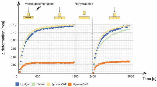 For cartilage deformation data in Figure 5, Hyruan ONE® reported an increase in the first 300 s. After that, it stabilized more or less at a value of 0.03. On the other hand, Hyalgan®, Ostenil® and Synvisc ONE® showed a similar logarithmic trend of the deformation development as during the run-in phase. Hyalgan® and Ostenil® showed the most significant increase in the first 500 s, when the cartilage deformation reached a value of 0.1 mm. During the same period, Ostenil® showed an increase of 0.08 mm. Compared to the first phase, this increase was lower and about 200 s longer. In the third phase, no flattening of cartilage deformation development was observed. The end values of the Z position were 0.113 mm for Hyalgan®, 0.109 mm for Ostenil®, and 0.116 mm for Synvisc ONE®.