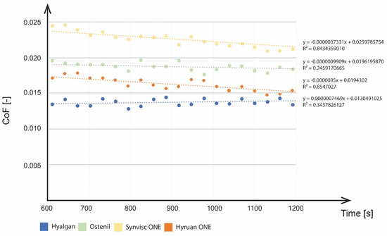 During the viscosupplementation phase, the viscosupplement was applied directly to the model SF between the articulating surfaces and the changes (increase/decrease) in cartilage-on-cartilage friction were analysed. The time of CoF stabilization was considered as the time when the liquids were ideally mixed. To determine the effects of the viscosupplementation agent on CoF, the phase ranging from 600 to 1200 s was interpolated by a linear regression line (Figure 6).