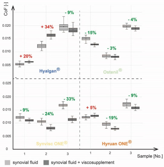 The CoF values ranged from 0.0051 to 0.0163 for the reference measurements. All samples showed a significant change in CoF between the reference and comparative measurements. A significant decrease in CoF was observed for all measurements except for measurements 1a, 1b and 4a. An increase in CoF was observed for Hyalgan® in two cases. The first measurement showed an increase of 20% and the second 34%. In the last measurement, a decrease in CoF by 9% was observed. Ostenil® measurements showed a decrease in CoF in all cases. Similarly, a decrease in CoF was observed for Synvisc ONE® for all measurements. In the case of Hyruan ONE®, CoF decreased in two cases. A 5% increase in CoF was observed in the first measurement. A 19% and 9% decrease was observed for the second and third measurements. On the basis of these results, an average change in the CoF was calculated for each viscosupplementation agent. Hyalgan® showed an average Increase in CoF of 15%. There was an average decrease of 7% for Ostenil®. The highest average decrease in CoF of 21% was observed for Synvisc ONE®. The last product, Hyruan ONE®, showed an average decrease of 8%.