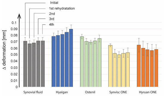The results of cartilage deformation measurements during liquid mixing tests showed a logarithmic trend similar to that in the case of viscosupplementation application tests. Maximum values of deformation were always reached at the end of the individual loading phases, lasting 300 s. The average values and standard deviation of cartilage deformation at the end of the individual loading phases for clear SF and all viscosupplementation agents are shown in Figure 8. For clear SF, cartilage deformation values at the end of the loading phases were quite similar for all loading phases, between 0.067 and 0.072 mm. Hyalgan® reported higher values of cartilage deformations compared to pure SF. Furthermore, the cartilage deformation values increased from 0.078 mm to 0.089 mm during the measurement. Ostenil® also showed higher cartilage deformation values compared to pure SF. However, no trend in the results was observed while the deformation ranges between 0.069 and 0.078 mm. Hyruan ONE® reported a lower deformation than SF. Apart from the last loading phase, the results reported a downward trend. The deformation decreased from 0.065 mm to 0.057 mm. Except for the initial loading phase, the lowest cartilage deformation values between 0.05 and 0.053 mm were measured for Synvisc ONE®.