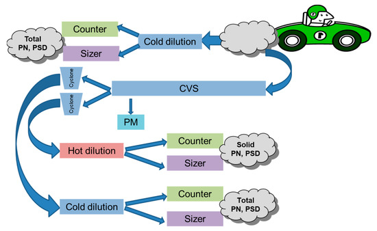 - The second location samples the exhaust downstream of the constant volume sampler (CVS) tunnel and cyclone separators, followed by continuous dilution with external heat. In this procedure, the evaporation tube is turned on to remove volatiles so that only solid particles are counted. This procedure is compliant with European Particle Measurement Programme (PMP) requirements.
