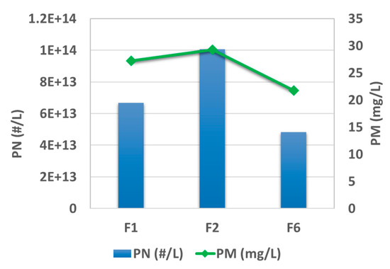 Figure 4 plots the results of post-TWC particle mass (PM) and particle number (PN) emission levels at the testing condition of 2000 rpm and 50% load. The rank of emission level for those three fuels is F2 > F1 > F6, for both mass and number. High aromatic fuel, F2, exhibits almost twice the PN emission (3.9 × 1013 #/kw·h) as F6 under the same testing condition. This trend is consistently shown under other testing conditions, as presented elsewhere [31]. In parallel, PAHs were characterized for the pre-TWC samples collected on the fiberglass filter, and the results are summarized in Figure 5 for three test fuels. The results indicate that higher aromatic content in the fuel brings about an elevated level of PAH emission, which can potentially harm public health and the environment. High aromatic fuel, F2, leads to 70% more PAH emission than F6 given the same testing condition.
