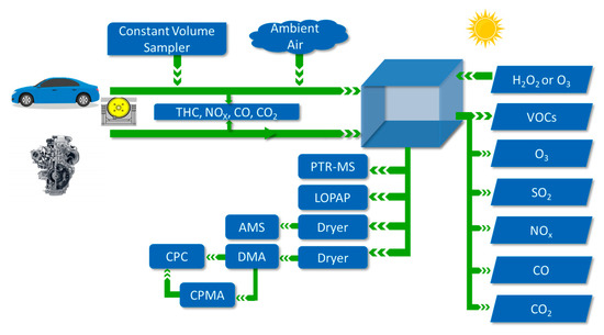 The work presented below used a smog chamber in conjunction with volatile organic compound (VOC) emission measurement equipment to investigate SOA formation. Other systems to assess this have been described elsewhere [36,37]. Figure 6 depicts the diagram of the smog chamber together with all the emission measurements. The test vehicle was a PFI vehicle, operated on the chassis dynamometer under a given driving cycle. The exhaust gas was first drawn into the CVS, in which the first stage of dilution took place. The total flow rate in CVS was kept at 5.5 m3/min. Then, about 5.3 L/min of diluted exhaust gas was introduced to the 1.2 m3 smog chamber, in which more fresh air would further dilute the exhaust gas as the smog chamber was exposed to the sunlight to promote the photochemistry reaction. The smog chamber was covered with two layers of anti-UV cloth to shield the chamber from sunlight prior to each test. Hydrogen peroxide was added to the chamber to provide an extra hydroxyl group (OH), assisting the formation of SOA. Details of the setup and measurement can be found in [38].