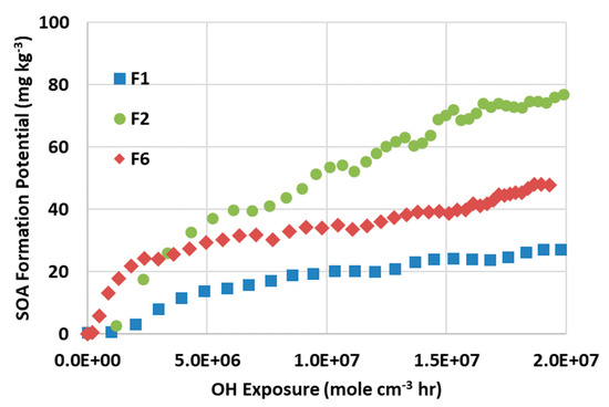 Aromatics in the fuel can produce some aromatic VOCs after combustion. A chemical reaction occurs when exhaust containing aromatic VOC encounters the OH radical in the atmosphere. SOA will be generated from those reactions, and the fuel’s aromatic content will affect the formation potential. OH exposure is used to compare the impact of different fuels on SOA formation potential. and is determined based on the ratio between benzene and toluene [39]. Figure 7 plots the SOA formation potential versus OH exposure for three fuels. Extended OH exposure promotes SOA generation, while the increasing rate slows down over time. F1 and F6 have similar SOA formation potential, while F2 has about a factor of three times higher. The elevated emission level with high aromatic fuel is well demonstrated for both primary particulates and SOA. These findings and other research work imply that emissions can be significantly reduced by improving fuel quality.