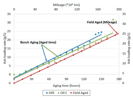 The FUL targeted in the cited work aimed to meet the China VI durability requirement, which is 200,000 km of driving. Two oils of different formulations were used for durability demonstration. They have the same SAPS (Sulfated Ash, Phosphorus, and Sulfur) level of 0.8% but use different detergent formulations. Oil F was Ca only detergent, while Oil C used mixed metal detergents including Ca and Mg. The results of ash loading are presented in Figure 8. According to work done by Ford researchers, a reference of total ash loading was 25 g/L and was matched by the researchers [47]. The durability demonstration adopts the proprietary aging protocol described elsewhere [48]. During the aging testing, lubricant oil was doped at 1% (vol) to achieve accelerated ash loading while minimizing the impact on combustion stability and engine health. Ash accumulation based on the accelerated aging protocol successfully loaded an equivalent amount on the filter between 150 h and 170 h, respectively for the two oils described. Under the engine operating condition and resulting temperature profile, it would take 43 h for the catalytic converter to reach the amount of thermal load equivalent to 200,000 km driving exposure. Therefore, the total aging time for ash far exceeds what would be experienced from real-world operation over full useful life operation. The results suggest that the ash loading rates match the field aged profile (Figure 8).