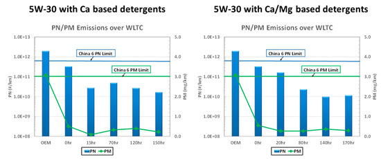 Although additives are utilized to enable the lubricant to meet performance requirements, some chemistry may directly or indirectly impact the emission level or the functionality of the emission control system. For example, zinc dialkyl dithiophosphate, known as ZDDP, has been used by the industry for over eighty years and is still the most cost-effective anti-wear agent and antioxidant. Meanwhile, the negative impact of phosphorous from ZDDP on the emission control catalyst has been studied and reported [41,42]. The controlled level of ZDDP can mitigate the known effect in the lubricant package. It was substantiated that a reasonable level of ZDDP will not harm the catalyst significantly, leading to the failure of emission performance compliance [43,44]. The primary role of detergents is to keep engines clean. Typical compounds are in the form of sulfonate, phenate, or salicylate. The most common metals are calcium and magnesium. These detergents can provide an efficient way to add basicity to the lubricant to neutralize combustion acids. During combustion, calcium and magnesium can form various compounds with phosphorous and sulfur, which are known to be harmful to emission control catalysts. The formation of specific compounds is known to provide a scavenging effect that can mitigate the negative impact of phosphorous and sulfur. The phosphorous level was set and controlled in industry specification ILSAC GF-3 onwards to 0.08% and successfully mitigated the earlier risks. In addition, Ca is known to be an oxidation catalyst, and its presence tends to assist oxidation of particulate in the exhaust [45]. In this paper, the research work demonstrated: (1) the compatibility between lubricant formulation and emission control system (Section 4.2), (2) the catalytic effect of lubricant chemistry on emission (Section 4.3).