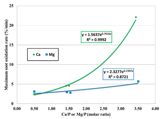A comprehensive evaluation of the impact of oil properties on GPF performance has been reported elsewhere [49]. Figure 11 [50] exhibited how PM oxidation was affected by the ratio between detergent metal and phosphorous. As Mg-based detergent was used in the oil (the blue line), little impact was observed regarding the PM oxidation rate. However, higher Ca/P increases the PM oxidation rate for calcium based detergent oil (the green line). This difference is attributed mainly to the detergent chemistry considering the other factors are maintained at the same level. As an oxidation catalyst, calcium can assist the PM combustion better than magnesium. The ratio between Ca and P will drive the dynamics of the oxidation and reduction process potentially through changing the catalytic activity, and the overall outcome is reflected in the PM oxidation rate.