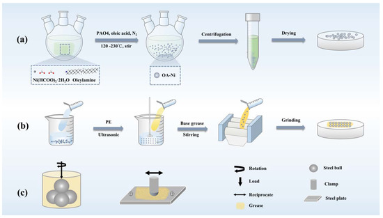 Four typical greases and OA-Ni nanoparticles were selected to fabricate doped grease. To evenly distribute OA-Ni in all greases, 0.3 wt% OA-Ni nanoparticles were added to four greases, respectively. Each grease sample was dissolved with 15 mL of PE. The mixtures were mechanically stirred at 50 °C until PE was completely evaporated. Subsequently, further dispersion was conducted in the ultrasonic machine for 30 min. Finally, the four greases consistent with OA-Ni were obtained after homogenization using the triple-roller mill three times (Figure 1b). The same degree of grinding was carried out for the pure greases to prevent the additional effects of grinding on the structure and properties.
