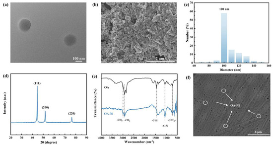 A transmission electron microscope (TEM, JEOL JEM200, Japan Electronics Corporation, Hiroshima, Japan) and a scanning electron micrograph (SEM, Mira3 XH, Tescan, Brno, Czech) were used to investigate the morphology and agglomeration state of OA-Ni, and the size distribution of the OA-Ni was simultaneously calculated by nano-measure software. X-ray diffraction (XRD, Smart Lab, Rigaku, Tokyo, Japan) and a Fourier transform infrared radiation spectrometer (FTIR, PerkinElmer Spectrum Two) were applied to establish the chemical structure of the OA-Ni nanoparticles.
