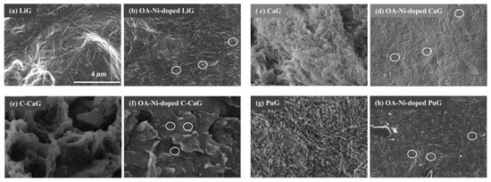 Characterization results: SEM images of (a) LiG, (b) OA-Ni-doped LiG; (c) CaG, (d) OA-Ni-doped LiG; (e) C-CaG; (f) OA-Ni-doped C-CaG; (g) PuG, and (h) OA-Ni-doped PuG. In the white circle are OA-Ni nanoparticles of the doped greases. All images have the same magnification.