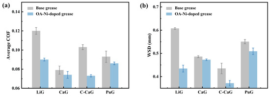 Tribological properties of the various pure grease and OA-Ni-doped grease under point-to-point contact: (a) average COF; and (b) WSD.