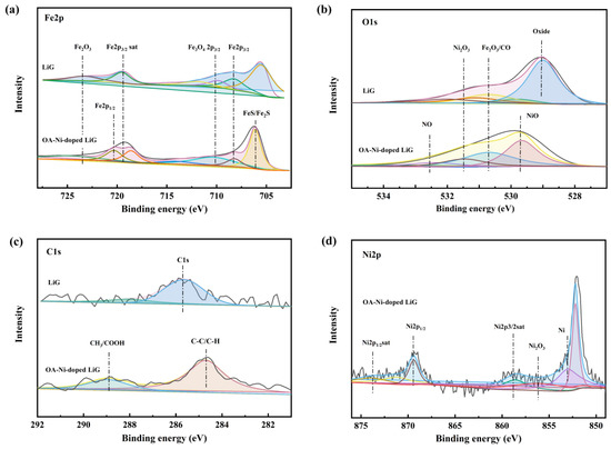 XPS spectra of (a) Fe2p; (b) O1s; (c) C1s; and (d) Ni2p on the worn scars of steel balls lubricated by LiG and OA-Ni-doped LiG after four-ball tests.